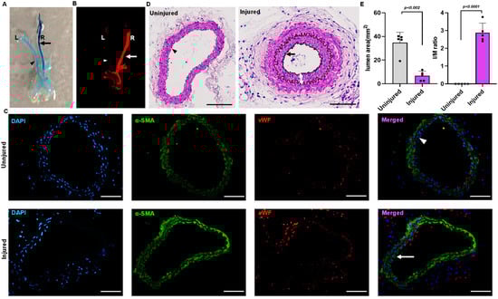 Endothelial denudation injuries was performed at the right carotid artery in three-month-old C57BL/6J mice. Evans blue staining of the carotid artery of the mice that underwent endothelial denudation injuries showed dark blue coloration compared to the uninjured arteries (Figure 1A). Carotid image analysis using an infrared imager (LI-COR Odyssey), wherein Evan blue provides autofluorescence at 700 nm, also showed a prominent Evans blue infiltration in the injured right carotid vascular wall following endothelial denudation (Figure 1B). In addition, immunostaining for the endothelial-specific marker von Willebrand factor (vWF) and the VSMC-specific marker α-actin was performed to further confirm vascular endothelial denudation. The finding indicates the absence of endothelial cells in the injured right carotid artery compared to the uninjured left carotid artery (Figure 1C). The carotid artery was harvested, paraffin-embedded, and sectioned on day 28. The uninjured (left carotid) artery was compared to the injured (right carotid) artery for neointimal hyperplasia through staining with hematoxylin and eosin. The neointimal hyperplasia was quantified using Image J software and represented as intima by media ratio and luminal area. The hematoxylin and eosin staining showed an increase in neointimal hyperplasia (p < 0.002) with decreased luminal size (p < 0.001) following vascular injury in the endothelial denudated vessel as compared to uninjured control at day 28 (Figure 1D,E).