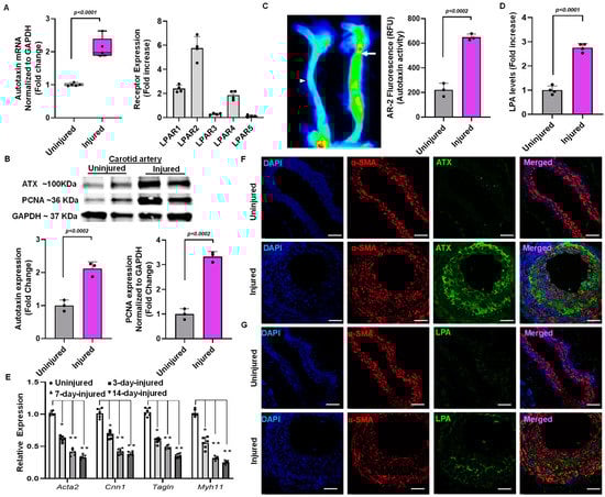 After surgery, the carotid arteries were collected for a reverse transcription polymerase chain reaction on day 14. The injured endothelial denudated carotid artery showed more than a two-fold increase in ATX mRNA level compared to an uninjured carotid artery at day 14 (Figure 2A). In addition, the injured carotid arteries exhibited more than a two-fold increase in the mRNA expression of various LPA receptors (Figure 2A). The uninjured and injured carotid artery tissues collected were blotted for ATX and proliferating cell nuclear antigen (PCNA) on day 14. ATX (p < 0.002) and PCNA (p < 0.002) protein expression was significantly upregulated in injured arteries compared to uninjured arteries when normalized to GAPDH (Figure 2B). After establishing upregulation of ATX after vessel injury, we investigated whether ATX enzymatic activity is regulated in the production of LPA. An ATX activity assay was performed using an AR2 fluorescence assay after vascular injury on day 14. Figure 2C shows that ATX activity was significantly upregulated in the injured carotid artery compared to the uninjured artery on day 14. The AR2 fluorescence measured using the LI-COR Odyssey infrared imager directly correlates with ATX activity in the carotid arteries in real time. Following the observation of increased ATX mRNA and protein expression and enhanced ATX activity in the injured vessels, we analyzed tissue LPA after injury. After vascular injury, we found more than a three-fold increase in tissue LPA levels compared to uninjured carotid arteries (Figure 2D) on day 14. Furthermore, the contractile markers Acta2, Cnn1, Tgln, and Myh11 were decreased in the injured carotid arteries compared to uninjured carotid arteries (Figure 2E), as indicated by assessment at days 3, 7, and 14 after wire injury/sham procedure. To further substantiate the role of the ATX-LPA axis in VSMCs mediating neointimal hyperplasia, we performed immunohistochemical analysis for ATX, α-smooth muscle actin, and LPA (Figure 2F,G). Our findings indicate significant upregulation of ATX and LPA levels following a vascular injury on day 14. Our confocal microscopy results suggest the co-localization of ATX and LPA to VSMC neointimal areas, which are highly upregulated and expressed following vascular remodeling.