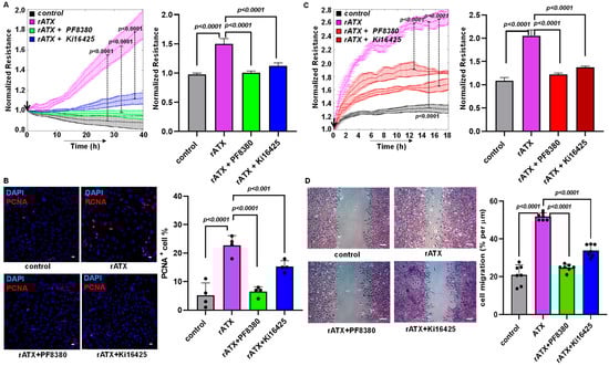 Previously, VSMC proliferation and migration have been observed to contribute to neointimal hyperplasia [34]. Furthermore, our earlier findings indicate that LPA treatment increases VSMC proliferation [35], and migration is one of the key factors contributing to neointimal hyperplasia [18,34,36]. Even though LPA was shown to regulate restenosis [18,34,37] significantly, ATX’s role in vascular remodeling and intimal hyperplasia remains unexplored. Therefore, we delineated the effect of ATX using isolated, cultured VSMCs from the murine aorta. VSMC proliferation and migration were determined in real time using an ECIS machine, which was followed by immunocytochemistry. We tested the effects of recombinant active ATX with and without PF8380 (ATX inhibitor) or LPAR1/LPAR2/LPAR3 receptor inhibitor Ki16425 treatment in our in vitro cell culture model. A profound increase in VSMC proliferation upon exposure to recombinant active ATX treatment was measured in real time using ECIS. Furthermore, a robust increase in proliferation upon exposure to recombinant active ATX treatment was confirmed by immunocytochemistry staining for proliferating cell nuclear antigen (PCNA; proliferation marker) at 48 h (Figure 3B). Both PF8380 and Ki16425 significantly reduced the effect of recombinant ATX-mediated VSMC proliferation as measured through the ECIS assay and the positive PCNA staining of VSMCs by immunocytochemistry. Next, we examined VSMC migration towards recombinant active ATX with or without PF8380 or Ki16425 (Figure 3C,D). We observed a two-fold increase in resistance by ECIS on VSMC migration upon exposure to recombinant active ATX. The migratory effect of VSMCs was further confirmed using a traditional wound healing scratch assay towards recombinant active ATX, which showed a more than a two-fold increase. With PF8380 and Ki16425 treatment, the migratory response of VSMCs mediated by recombinant active ATX was highly attenuated, as observed with both ECIS and the wound healing scratch assay. Together, these results indicate that the ATX-LPA axis regulates the proliferation and migration of VSMCs, particularly under pathological conditions where ATX is upregulated after vascular injury. These results suggest that the ATX-LPA axis can trigger VSMC proliferation and migration.