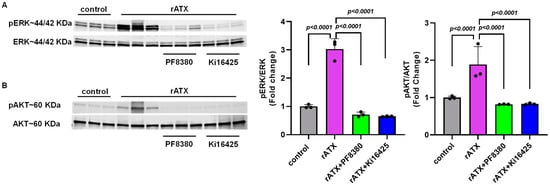 To investigate the mechanism(s) by which ATX might regulate vascular injury responses, we measured cell proliferation signaling markers for these events after exposure of VSMCs to recombinant active ATX. To identify whether the AKT–ERK signaling pathway is associated with the proliferation and migration of VSMCs induced by ATX, we measured the phosphorylation of these proteins through Western blotting. We found that VSMC exposure with recombinant active ATX (10 nmol/L) increased ERK activation, as measured by the ratio of phospho-ERK to total ERK at 2 h. Furthermore, we observed that the ERK activity induced by recombinant active ATX was significantly reduced by treatment with the ATX inhibitor (PF8380; p < 0.0001) or with the LPA receptor inhibitor (Ki16425; p < 0.0001) (Figure 4A). Similarly, we observed that phospho-AKT levels were significantly elevated compared to the control group when the VSMCs were exposed to recombinant active ATX (10 nmol/L) for 2 h. In addition, AKT activity induced by recombinant ATX was reduced by PF8380 and Ki16425 by ~50% (Figure 4B). These results indicate that the ATX-LPA axis mediates VSMC proliferation and migration through the AKT/ERK signaling pathway, causing vascular remodeling.