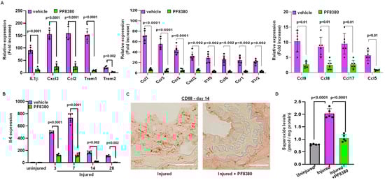 Treatment with the ATX inhibitor rescues mRNA encoding proteins associated with inflammation following injury. (A) Chemokine and cytokine mRNA expression was measured on day 3 with and without PF8380 treatment following injury. (B) Transcriptional mRNA expression levels of IL-6 with and without PF8380 treatment for different time points. (C) Representative sections of mouse carotid artery stained with CD68 antibody (C68-target for macrophages) with and without PF8380 treatment at 2 weeks after injury. Scale bar = 50 μm. (D) Superoxide measured using high-performance liquid chromatography in uninjured, injured, and PF8380-treated mice at day 14. All values are mean ± SD (n = 6) compared to the uninjured vessel using the Mann–Whitney U test.