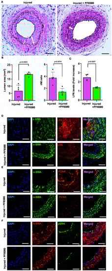 Treatment with the ATX inhibitor rescues neointimal hyperplasia. (A) Hematoxylin and eosin staining sections of the injured carotid artery with and without PF8380 treatment at 4 weeks after injury. Scale bar = 50 μm. (B) Quantifying luminal area and I/M ratio with and without PF8380 treatment at 4 weeks after injury. (C) Carotid tissue LPA levels with and without PF8380 at 3 weeks after injury. (D) Mouse carotid artery stained for LPA with and without PF8380 treatment at 4 weeks after vascular injury. Scale bar = 10 μm. (E) Immunofluorescence staining for PCNA in injured carotid arteries with and without PF8380 treatment at 4 weeks after vascular injury. Scale bar = 10 μm. (F) Immunohistochemistry for phospho-ERK in injured carotid arteries with and without PF8380 treatment at 4 weeks after vascular injury. Scale bar = 10 μm. All values are mean ± SD (n = 3) compared to the uninjured vessel using the Mann–Whitney U test. LPA—lysophosphatidic acid; LPAR—lysophosphatidic acid receptor; ATX—autotaxin; PCNA—proliferating cell nuclear antigen.