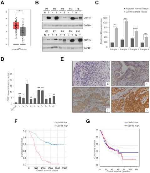 2.1. GDF15 Expression in Human Gastric Normal Tissue and Gastric Cancer Tissue and Serum