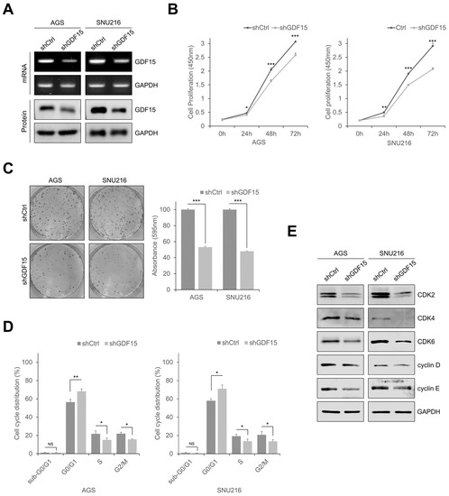 To investigate how GDF15 regulates tumor progression in gastric cancer, stable cell lines (AGS and SNU216) were established by GDF15 knockdown, and knockdown of GDF15 was confirmed by RT-PCR and Western blotting analysis (Figure 2A). GDF15-knockdown cells showed significantly reduced cell proliferation and colony formation compared to shCtrl cells (Figure 2B,C). The percentage of cells in the G0/G1 phase of the cell cycle remarkably increased after knockdown, whereas the percentage of cells in the S and G2/M phases decreased in both GDF15-knockdown cell lines (Figure 2D and Figure S1). Western blotting analysis also showed that the cell cycle regulatory proteins such as CDK2, CDK4, CDK6, cyclin D, and cyclin E were downregulated following GDF15 knockdown (Figure 2E). These findings indicate that GDF15 knockdown inhibits cell growth by inducing cell cycle arrest in gastric cancer cells.