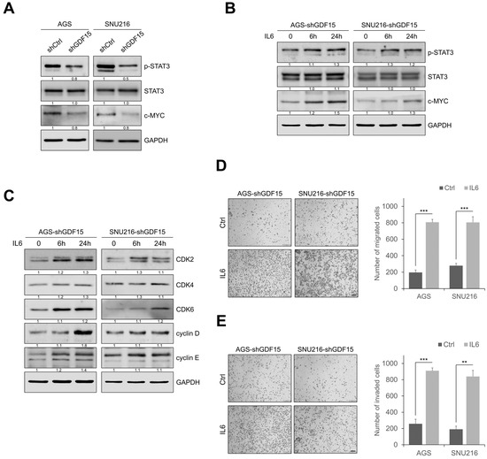 We next investigated the mechanisms by which GDF15 induces carcinogenesis in gastric cancer cells. Previous studies reported that GDF15 is required for the activation of STAT3 and tumorigenesis in thyroid cancer and glioma stem cells [31,32]. We thus examined whether the blockade of GDF15 affected the STAT3 activation in gastric cancer cells. We observed that GDF15 knockdown decreased the phosphorylation of STAT3 and c-MYC (Figure 4A). In addition, there are several signaling pathways including AKT, ERK, p38, and NF-κB that are regulated by GDF15 in other cancers [33,34]. When we further screened whether these signaling pathways are perturbed in GDF15-knockdowned gastric cancer cells, we found that the activation of AKT, ERK, p38, and NF-κB was not different between shCtrl and GDF15-knockdown gastric cancer cells (Figure S2A). These data suggest that GDF15-mediated tumorigenesis is mainly mediated through STAT3, but not these signaling pathways in gastric cancer cells. Furthermore, to determine the association between GDF15 and STAT3 in gastric cancer, we analyzed their correlation in the GEPIA dataset (Figure S2B). The data suggested that GDF15 expression is associated with STAT3 expression in gastric cancer. These findings suggest that the GDF15-STAT3 signaling axis regulates tumor progression. To determine whether GDF15 regulates STAT3 expression, we added IL-6, a growth factor and inducer of STAT3 phosphorylation, to GDF15-knockdown cells (Figure 4B). IL-6 treatment remarkably increased the phosphorylation of STAT3. Additionally, cell cycle regulatory proteins such as CDK2, CDK4, CDK6, cyclin D, and cyclin E levels were increased by IL-6 in GDF15-knockdown cells (Figure 4C). Furthermore, IL-6 increased cell migration and invasion and reversed the effect of GDF15 knockdown (Figure 4D,E). To determine whether the expression of STAT3 and its downstream factors is regulated by GDF15, we transiently transfected siSTAT3 to GDF15-overexpressing cell lines (Figure S2C,D). Furthermore, to determine whether STAT3 activity was required for GDF15-mediated migration and invasion, we transiently transfected siSTAT3 into GDF15-overexpressing cell lines (Figure S2E). These results demonstrate that GDF15 regulates cell migration and invasion through STAT3 in gastric cancer cells.