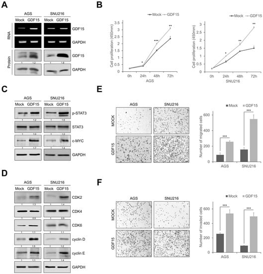 To evaluate the role of GDF15 in the proliferation, migration, and invasion of gastric cancer cells, we established GDF15-overexpressing cell lines (Figure 5A and Figure S3A). GDF15 overexpression increased cell proliferation and colony formation in gastric cancer cells compared to that in mock cells (Figure 5B and Figure S3B). STAT3 phosphorylation and c-MYC levels were remarkably increased in GDF15-overexpressing cells (Figure 5C). In addition, GDF15 overexpression also increased the expression of the cell cycle regulatory proteins such as CDK2, CDK4, CDK6, cyclin D, and cyclin E (Figure 5D). GDF15 overexpression also remarkably increased cell migration and invasion (Figure 5E,F). In addition, GDF15-overexpressing cells exhibited increased motility in the gap closure assay (Figure S3C). GDF15-overexpressing cells almost closed wide gaps compared to mock cells. These results reveal that GDF15 promotes cellular motility and invasion via active STAT3 signaling.