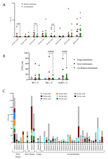 Analysis of β3, β4, and αVβ5 co-expression on CTCs did not reveal significant differences in patients with different localization of metastasis. Therefore, we evaluated the mono-expression of β3, β4, and αVβ5 integrins on CTCs in relation to the localization of distant metastases (Figure 2B).