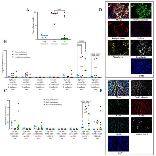 The proportion of β4-positive cells was higher in patients with liver metastases (95.19 (74.54; 97.0)%) compared to patients without metastases (3.22 (0.12; 83.39)%, p = 0.0285) (Figure 3A,D,E). In-depth analysis of β4+ tumor cells’ phenotypic characteristics taking into consideration stemness and EMT features revealed a significantly increased proportion of E-cadherin+ (Figure 3B) and CD44+CD24- cells (Figure 3C) in patients with liver metastases compared to patients with lung or without distant metastases.