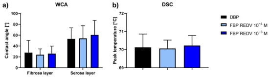 WCA and DSC analyses. (a) Water contact angle measurements on the functionalized serosa and fibrosa sides of DBP (functionalized bovine pericardium, FBP); (b) differential scanning calorimetry (DSC) peak temperature of functionalized DBPs in the hydrated state recorded at 20 °C/min between 25 °C and 90 °C.