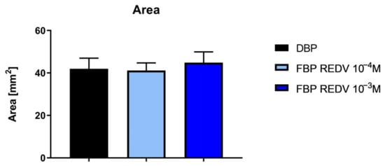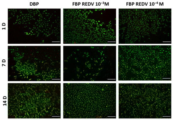 Regarding DBP, a significant difference was detected in the number of viable cells between 24 h and 14 days, while in the case of FBP REDV 10−3 M, a significant difference was found between 24 h and both 7 and 14 days. In the case of FBP REDV 10−4 M, however, no significant differences were discovered.