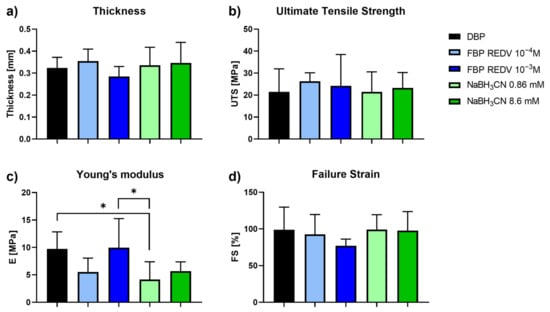 Interestingly, the thickness, the failure strain, the ultimate tensile strength, and Young’s modulus (Figure 5c) did not show any significant variation between DBP and functionalized bovine pericardium (FBP REDV 10−4 M and FBP REDV 10−3 M). Indeed, with regard to the Young’s modulus, a significant difference appeared between DBP and FBP REDV 10−3 M if compared with NaBH3CN 0.86 mM, p = 0.0154 and p = 0.011, respectively.