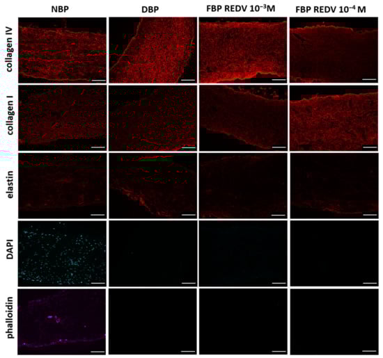 Direct and indirect immunofluorescence staining were performed in NBPs, DBPs, and functionalized tissues (FBP REDV 10−3 M and FBP REDV 10−4 M) in order to assess the effect of decellularization and peptide functionalization on the extracellular matrix (ECM) in the microstructure.