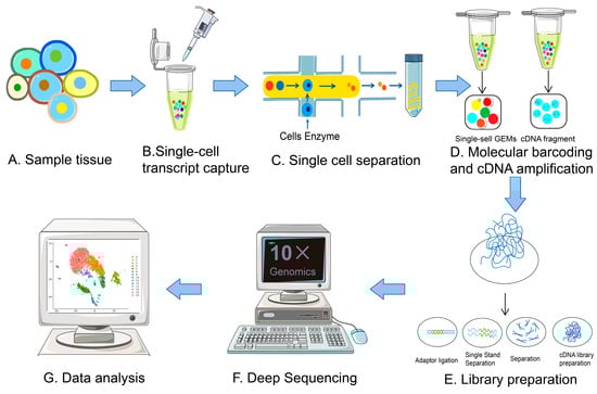 An overview of the single-cell RNA-sequencing procedures. (A) collect cells from tissue samples. (B) Single-cell capture process. (C) Cell isolation process. (D) Reverse transcription of mRNA and amplification of cDNA. (E) Construction of the scRNA-Seq library. (F) Complete deep sequencing of scRNA-Seq. (G) Analysis of scRNA-Seq data.