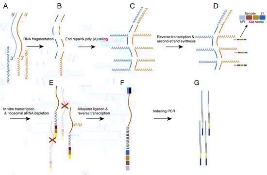 Overview of the VASA-seq workflow. (A) Collection of RNA in single cells. (B) Fragmentation process of RNA fragments. (C) Repair of RNA fragments and polyadenylation. (D) Reverse transcription of mRNA and completion of cDNA synthesis (E) In vitro transcription process. (F) Adaptation of aptamer Ligation and reverse transcription processes. (G) Indexing PCR.