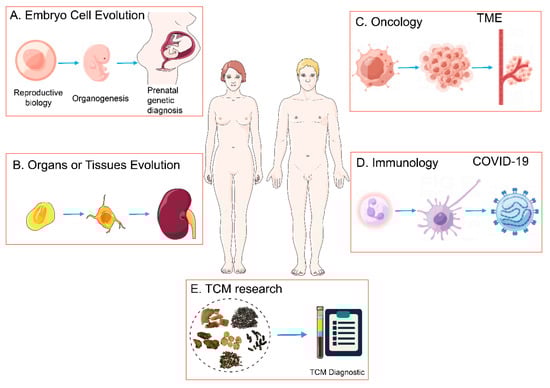 Application of single-cell RNA-sequencing technology. (A) Embryonic development. (B) Tissue and organ development. (C) Oncology. (D) Immunology. (E) TCM research.