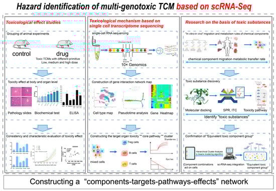 The quality uniformity and safety of Chinese medicines are still bottlenecks that currently limit the rapid development of the TCM industry [,,]. Currently, there is a lack of toxicity data for many toxic herbal medicines, especially for multi-base source TCM, and there is confusion about the variety of herbs marketed. Is the toxicological profile consistent across different multi-base source TCM for the same medicinal use? At present, there are two key challenges. Firstly, the information on toxicity mechanisms is fragmented, and there is a lack of comprehensive consideration of toxicity outcomes from multiple cellular perspectives. Secondly, there are significant differences in component categories and contents between species; the basis of toxic substances is unclear, and there is a lack of “equivalent toxic component groups” that can characterize the toxicity of TCM as a whole. In view of this, how to investigate the content of toxic components and the mechanism of toxicity in multi-base source TCM is a critical problem in ensuring the safety and quality control of clinical usage. The group proposed a “hazard identification of multi-genotoxic TCM based on scRNA-Seq” by taking into account the three elements, namely toxicity effects, toxicity mechanisms, and toxic substances, and considering the migration and metabolism of components and interactions, with the help of scRNA-Seq and other multidisciplinary tools (Figure 4). Firstly, the toxicity of target organ tissues due to long-term administration was clarified by animal administration, the toxicity trends and key toxicity indicators were identified by plotting the dose–toxicity curves, and the consistency and characteristics of the toxicity effects of multi-base source TCM on target organs were clarified. Subsequently, scRNA-Seq and a quantitative real-time polymerase chain reaction (q-PCR) were used to reveal the cellular targets, key cellular subgroups, and toxicity pathways of TCM in target organs at the molecular and cellular levels. Through mass spectrometry analysis, the migration and metabolism rules of toxic components for different genes were found. Surface plasmon resonance technology and virtual screening technologies, such as network pharmacology and molecular docking, were used to screen out “toxic substances”, analyze cell types, and use Western blotting to verify the toxicity pathway. Finally, a variety of analytical methods were utilized to construct an “equivalent toxic component group” capable of characterizing the toxicity of multi-base source TCM. The method constructs a “components–targets–pathways–effects” network from three aspects (toxic effects, toxic mechanisms, and toxic substances), providing technical support for the identification of multi-origin toxic TCM hazards, which has been applied in the study of the mechanisms of toxic action of TCM, such as Uncaria.