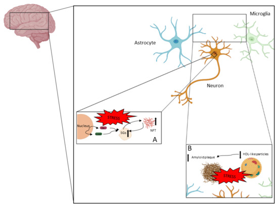 AD is a neurodegenerative disease in which neurodegeneration is driven by different processes. NFTs and amyloid plaques are the two main pathological features in AD. (A) NFTs are accumulations of hyperphosphorylated tau and other components. Tau hyperphosphorylation and aggregation could be driven by the pathological accumulation of SGs, which could be a consequence of chronic stress. (B) Amyloid plaque is an extracellular pathological feature (with intracellular intermediates) that mainly contains Aβ peptides. Amyloid plaque formation is highly associated with the clearance capacity of apolipoproteins contained in HDL-like particles.