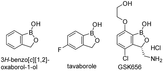 - Adamczyk-Wozniak, A.; Borys, K.M.; Sporzynski, A. Recent Developments in the Chemistry and Biological Applications of Benzoxaboroles. Chem. Rev. 2015, 115, 5224–5247. [Google Scholar] [CrossRef]