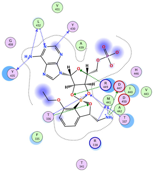 The design of our compounds started with the experience of the above-mentioned research group [13]. The bidentate covalent adduct of benzoxaborole with Ade76 of tRNA may be mimicked by an adduct with adenosine monophosphate (AMP) [28,29]. Under the proper inspection of the crystallographic structure of Mtb H37Rv LeuRS co-crystallized with a confirmed inhibitor in the form of the spiro adduct with AMP (PDB ID: 5AGR, see Figure 2), it is visible that most of the H-bond interactions occur between the merged ribose part of the adduct and amino acid residues T336 and T337 of the threonine-rich region. There are several other H-bond interactions and hydrophobic contacts between L432 and Y435 of the AMP binding loop and AMP. Finally, the research group described three additional key interactions of the amino group of (S)-3-(aminomethyl)-7-ethoxybenzo[c][1,2]oxaborol-1(3H)-ol (Figure 2) to carboxylic acid side chains of D447, D450, and the carbonyl group of M441. The 7-ethoxy substitution was important for packing with the Ade76 ribose, thus further stabilizing the boron-tRNA adduct. The research group concluded an extensive SAR study on the interaction with Mtb LeuRS using isothermal titration calorimetry. Halogen substitution (Cl/Br) in position 4 of benzoxaborole can enhance its affinity to the Mtb LeuRS editing domain [13]. In the following study, the authors concluded that the positions C-6 and C-7 are solvent-exposed and may be used for further structural modification to improve the selectivity. Large aromatic substitution in position 7 led to a decrease in antimycobacterial activity. For the modification of C-6, only aliphatic substitution was applied [14].