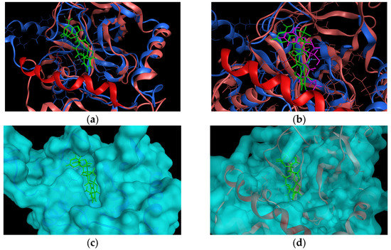 (a) Superimposition of 5AGR mtbLeuRS (blue color) with co-crystallized adduct (S)-3-(aminomethyl)-7-ethoxybenzo[c][1,2]oxaborol-1(3H)-ol-AMP as a ligand (light green color) and 2WFD hLeuRS (pink color) with highlighted additional alfa-helix (red color). (b) Superimposition of 5AGR mtbLeuRS (blue color) with ligand (green color) and 6LPF hLeuRS (pink color) with co-crystallized 2’ (L-norvalyl)amino-2’-deoxyadenosine and 5’-O-(L-leucylsulfamoyl)adenosine as a ligand (purple color) and highlighted additional alfa-helix (red color). (c) 5AGR mtbLeuRS with a calculated surface area of the enzyme (light blue color) and co-crystallized adduct (light green color). (d) 2WFD hLeuRS with a calculated surface area of the enzyme (light blue color) and co-crystallized adduct from 5AGR (light green color).