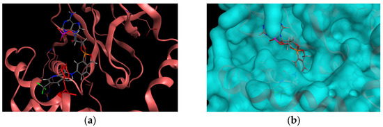 Superimposition of the hLeuRS (PDB ID: 2WFD) visualized with docking results of compound 11 (grey color). (a) 2WFD hLeuRS (pink color) visualized without calculated surface with highlighted Y468 (red color). (b) 2WFD hLeuRS visualized with the calculated surface.