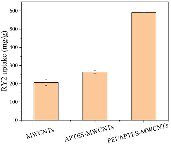 Figure 1. RY2 uptake on MWCNTs, APTES-MWCNTs, and PEI/APTES-MWCNTs. (Ci = 200 mg/L, sorbent amount = 10 mg, pH = 2).