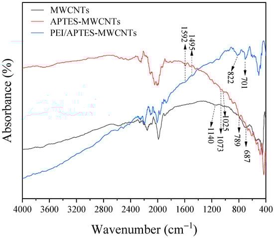 The FTIR spectra of MWCNTs, APTES-MWCNTs, and PEI/APTES-MWCNTs are compared in Figure 3. The presence of the broadband between 3400 and 3800 and 1140 cm−1 is due to the presence of hydroxyl groups on the surface of MWCNTs, which was caused by moisture in the ambient air or by oxidation of raw materials during the purification process [21]. The peak at 687 cm−1 was attributed to aromatic C–H bending vibration [22]. After being grafted by APTES, new peaks appeared in the FTIR spectrum of APTES-MWCNTs. The peak at 1592 cm−1 was assigned to –NH2 bending vibration [23]. The weak peaks displayed at 1073 and 1025 cm−1 were attributed to C–O–Si and Si–O–Si stretching vibrations [24], while the peak at 789 cm−1 was due to Si–O–Si symmetric stretching vibrations [25]. These results revealed that the APTES molecules were successfully grafted on the surface of MWCNTs. In the FTIR spectrum of PEI/APTES-MWCNTs, the peaks at 1592 and 1495 cm−1 were attributed to N–H bending vibrations of –NH2 and –NH, respectively [23,26]. In addition, the peaks at 822 and 701 cm−1 were assigned to C–N outside rocking vibration [26]. The above results suggested that PEI molecules were crosslinked with APTES-MWCNTs.