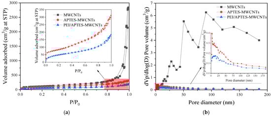 Figure 4. (a) N2 adsorption–desorption isotherms and (b) pore size distribution of MWCNTs, APTES-MWCNTs, and PEI/APTES-MWCNTs.