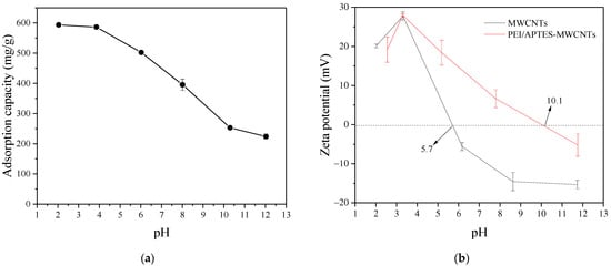 Solution pH is an important factor affecting the adsorption performance of adsorbents. The relationship between the solution pH and the adsorption capacity of RY2 on PEI/APTES-MWCNTs was investigated by altering the initial pH of the RY2 solution under controlled experimental conditions (Figure 5a). The PEI/APTES-MWCNTs showed the highest adsorption capacity (593.6 ± 1.3 mg/g) for RY2 at pH 2.0. The dye uptake on PEI/APTES-MWCNTs slightly decreased to 586.4 ± 3.8 mg/g with increasing pH to 4.0. Hereafter, the adsorption capacity of PEI/APTES-MWCNTs for RY2 dropped sharply to 224.0 ± 8.3 mg/g when the pH was raised to 12.0. To further explain the adsorption performance of PEI/APTES-MWCNTs for RY2, zeta potential analysis was performed, and the results are displayed in Figure 5b. The pHIEP (isoelectric point of pH) of the MWCNTs increased from 5.7 to 10.1 after modification by APTES and PEI, indicating that APTES and PEI successfully modified the MWCNTs. In addition, the surface of PEI/APTES-MWCNTs is positively charged when the solution pH is below 10.1 and negatively charged when the pH is above 10.1. On the other hand, the pKa of primary, secondary, and tertiary amine groups are 4.5, 6.7, and 11.6, respectively [31]. Thus, at pH < pHIEP, the primary and secondary amine groups on PEI/APTES-MWCNTs surface were protonated. The protonated primary (NH3+) and secondary (NH2+) amine groups readily bind to the negatively charged sulfonate groups (-SO32−) of RY2 via electrostatic interaction [32]. On the contrary, the gradual deprotonation of protonated amine groups with the increase in pH reduced RY2 uptake [33]. When pH > pHIEP, the surface of PEI/APTES-MWCNTs was entirely deprotonated, but the uptake of RY2 was still evident. In this case, the adsorption of RY2 on PEI/APTES-MWCNTs was mainly achieved by π–π stacking and hydrogen bonding [19,34]. Since the maximum dye uptake was reached at pH 2, it was chosen for the subsequent studies.