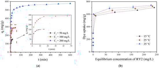 Figure 6. (a) Adsorption kinetics of RY2 on PEI/APTES-MWCNTs at 50–200 mg/L initial concentrations; (b) adsorption isotherm of RY2 on PEI/APTES-MWCNTs at different temperatures (15–35 °C).