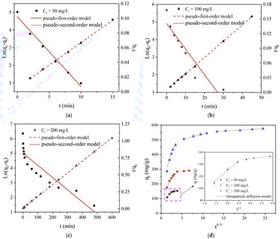 Figure 7. Pseudo-first/second-order modeling of RY2 adsorption on PEI/APTES-MWCNTs at an initial concentration of (a) 50, (b) 100, and (c) 200 mg/L, respectively; (d) intraparticle diffusion modeling of RY2 adsorption on PEI/APTES-MWCNTs.