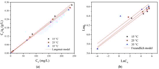 The adsorption isotherm data fitted by the Langmuir and Freundlich models are shown in Figure 8, and the corresponding parameters are listed in Table 3. The higher value of the correlation coefficient (Adj. R2) of the Langmuir model revealed that it was more applicable to describe the isothermal sorption behavior. The experimental maximum adsorption capacities were close to the theoretical results calculated by the Langmuir model, further supporting its ability to interpret the isothermal data. Therefore, the adsorption of RY2 on PEI/APTES-MWCNTs could be attributed to monolayer adsorption on the homogeneous surface [42]. The Langmuir constant increased with temperature, indicating that the adsorption affinity of the adsorbent for RY2 was higher at high temperatures. The value of the separation factor was between 0 and 1, which was closer to 0, indicating that the adsorption of RY2 on PEI/APTES-MWCNTs was highly favorable. The theoretical maximum dye uptake was 689.66, 714.29, and 735.30 mg/g at 15, 25, and 35 °C, respectively, which were higher than most of the functionalized MWCNTs reported to date (Table 4). The maximum adsorption increased with temperature, indicating the adsorption process was endothermic. Thermodynamic analysis was performed to illustrate further the effect of temperature on the adsorption of RY2 by PEI/APTES-MWCNTs.