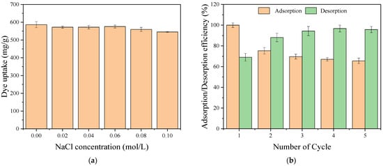 Figure 9. (a) Effect of ionic strength on RY2 adsorption by PEI/APTES-MWCNTs; (b) adsorption/desorption efficiencies of PEI/APTES-MWCNTs for RY2 removal.