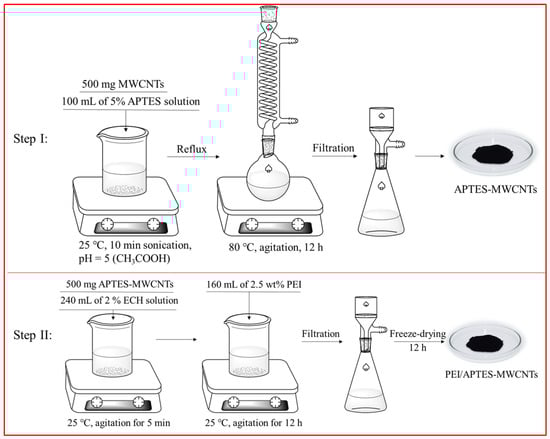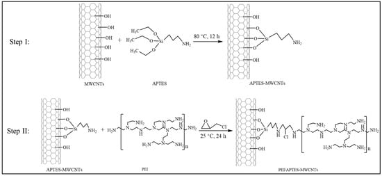 The preparation of PEI/APTES-MWCNTs consists of two steps: grafting APTES on the MWCNTs’ surface and crosslinking PEI with APTES-MWCNTs using ECH as a crosslinker. The illustrations of the preparation process and the reaction pathway are presented in Figure 10 and Figure 11, respectively. Here are the details: