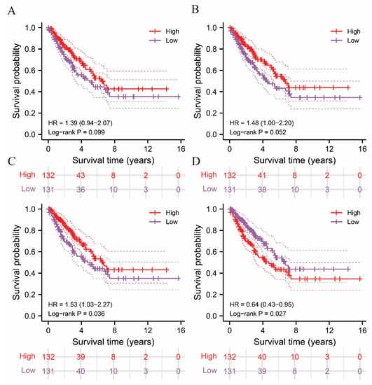 Survival analysis performed in high and low immune score groups using ESTIMATE algorithm and illustrated in Kaplan–Meier (K-M) curves. (A) Immune score, (B) stromal score, (C) ESTIMATE score, and (D) tumor purity score.
