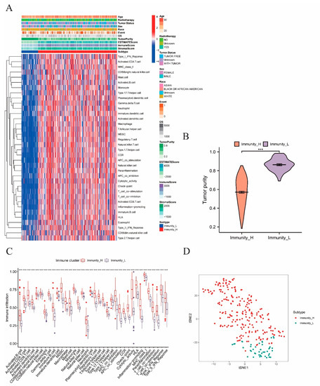 Identification of immune subtypes and differential analysis. The symbols *** represent p-values less than 0.001. (A) The ssGSEA analysis performed on the 263 samples to divide the samples into two groups according to 30 ssGSEA scores of each sample. (B) Differential analysis on tumor purity score between immunity−high and −low groups. (C) Box plot presenting the immune−cell infiltration levels of the immunity−high and −low groups, with the red boxes and blue boxes representing immunity−high and −low groups, respectively. (D) The t−SNE analysis on the two immune subtypes, with the red dots and blue dots representing immunity−high and −low groups, respectively.