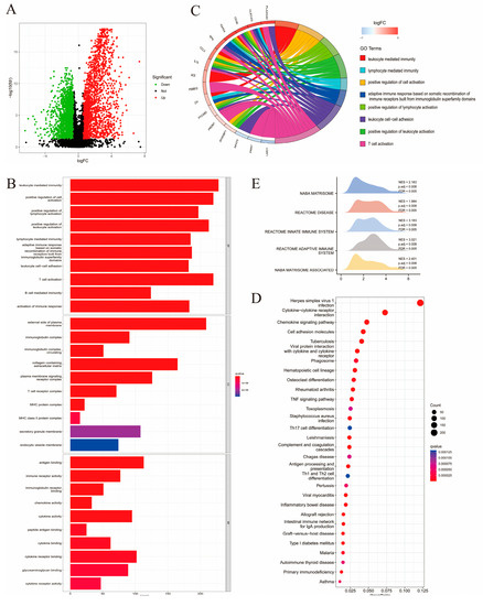 Enrichment analysis performed on DEGs obtained from the two immune subtypes. (A) Volcano plot demonstrating the regulation in DEGs expression, with the green, black, red dots representing down-, not-, and upregulation, respectively. (B) The histogram showing the top 10 enriched GO biological processes (BP), cell components (CC), and molecular functions (MF). (C) Circle graph presenting the top eight enriched GO terms. (D) Bubble chart demonstrating the top 30 enriched KEGG pathways, with the size of dot representing the enriched count. (E) Mountain plot listing the top five pathways with the most DEG enrichment according to Gene Set Enrichment Analysis (GSEA).