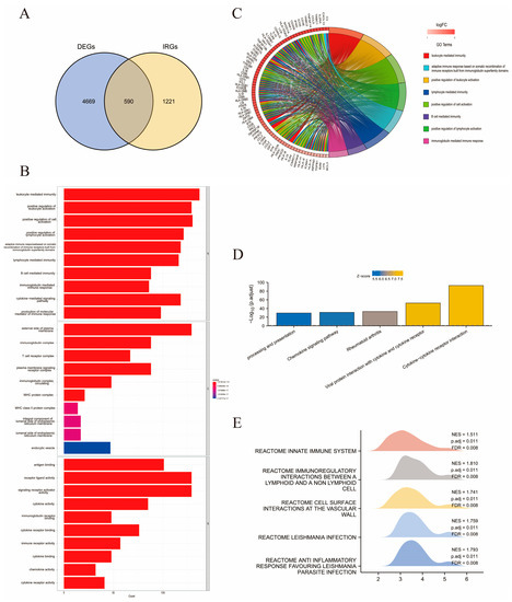 Identification of immune-related DEGs and enrichment analysis. (A) Venn gram showing the overlapping of 5259 DEGs and 1811 IRGs by 590 immune-related DEGs. (B) The histogram showing the top 10 enriched GO terms. (C) Circle graph presenting the top eight enriched GO terms. (D) Bar chart indicating the top five enriched KEGG pathways. (E) Mountain plot listing the top five pathways with the most gene enrichment according to GSEA analysis.