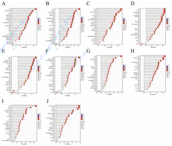 Immune cell infiltration analysis performed on the ten hub genes, presented in the form of lollipop charts. (A–J) Lollipop charts for BST2, IFITM1, IRF1, IRF5, IRF7, ISG15, MX1, PSMB8, RSAD2, STAT1, respectively.