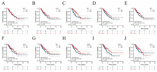 Survival analysis performed on the ten hub genes.