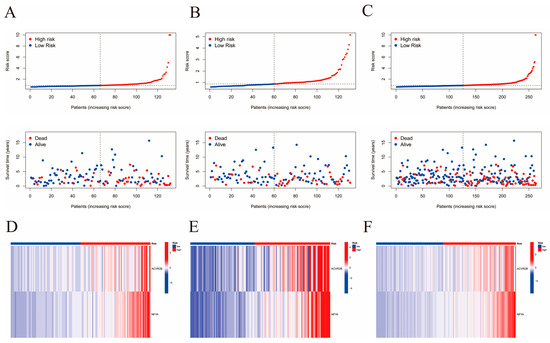 Analysis of correlation between high- and low-risk scores with survival and candidate gene expression. (A–C) Correlation between risk score and survival rate, based on training, validation, and the initial merged cohort, respectively. (D–F) Expression level of the two selected genes in the high- and low-risk groups, respectively, based on training, validation, and the initial merged cohort.