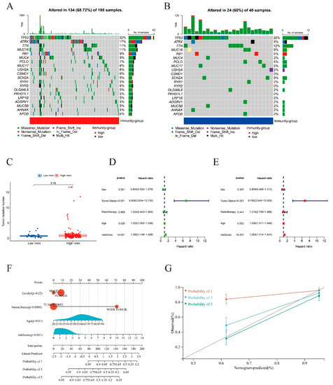 Mutation analysis and validation of the risk signature. (A,B) Mutation rate analysis performed on immunity−high and −low groups, with colors red and blue representing immunity−high and −low groups, respectively. (C) Tumor mutation burden of immunity−high and −low groups. (D,E) Forest plots of the univariate and multivariate Cox analysis for the risk score and clinicopathological parameters (sex, tumor status, radiotherapy, age) with overall survival. (F) Nomogram including clinical characteristics including gender, tumor status, age, and risk score. The “total score” axis corresponds to the 1−, 3−, and 5−year overall survival probabilities on the lower axis, representing the prognostic survival of sarcoma patients with distinct total scores for 1, 3, and 5 years. (G) Calibration curves for nomogram.