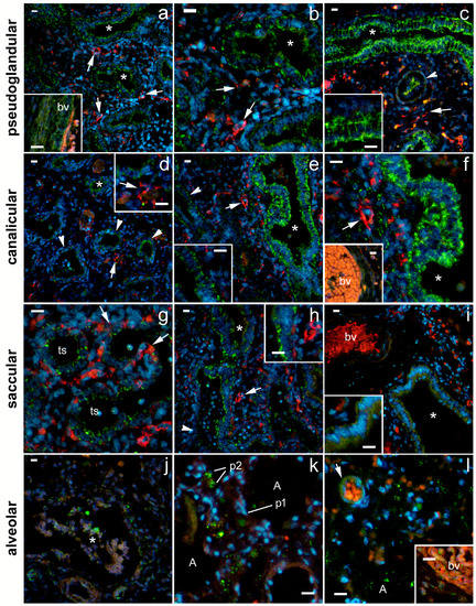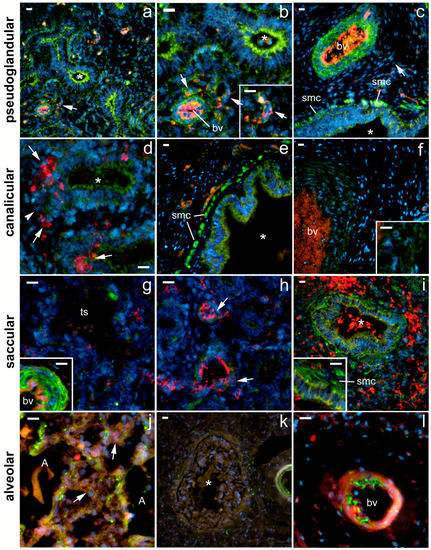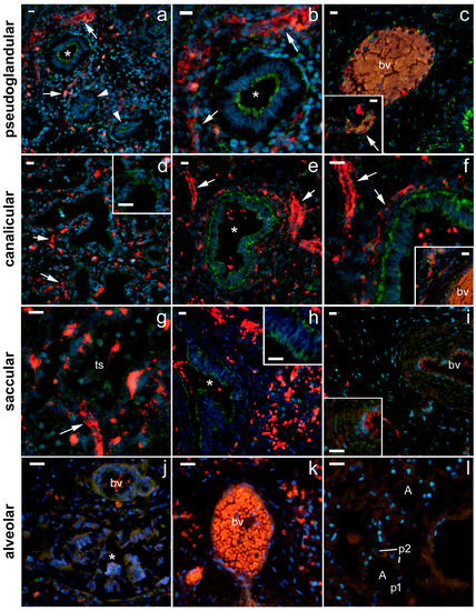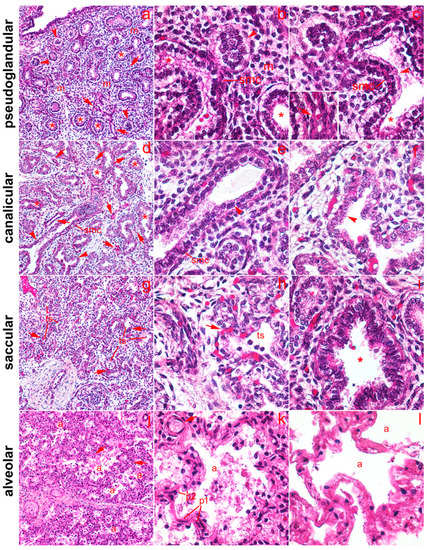 Fetal lungs at various stages of development. (a–c) Pseudoglandular stage. (a) 100× magnification shows typical appearance of lung in pseudoglandular stage with small lumina of proximal airways (asterisks) and abundant mesenchyme (m) with some blood capillaries (arrows). Lumina of some proximal airways are not yet open (arrowheads). (b,c) Details of lung histology in the pseudoglandular phase (400× magnification): proximal airways with columnar epithelium (asterisks); transition from proximal to distal airways (arrowheads), shown in (c), where the transition from columnar to cuboidal epithelium is clearly visible; m—mesenchyme; smc—smooth muscle cells visible beneath the proximal airway epithelium. Inset in (c)—detail of capillary (arrow) with red blood cells. (d–f) Canalicular stage. Larger lumina of proximal airway and increased vascularity can be seen. (d) 100× magnification; (e,f) 400× magnification. (f) The epithelium lining the distal airways is cuboidal (arrowhead). (g–i) Saccular stage (terminal sac), showing the development of terminal sacs (ts) with differentiation of type I and II pneumocytes from the cuboidal epithelium and the invasion of capillaries (arrows) are clearly visible. (g) 100× magnification; (h,i) 400× magnification. (h) Detail of end sac showing differentiation of type I and II pneumocytes from cuboidal epithelium; (i) detail of proximal airway showing columnar epithelium. (j,k,l) Alveolar stage, showing development of characteristic alveoli, shown in (a), with thin septal walls and differentiation of type I (p1) and II pneumocytes (p2). (j) 100× magnification; (k,l) 400× magnification. (l) Details of developed alveoli (a).