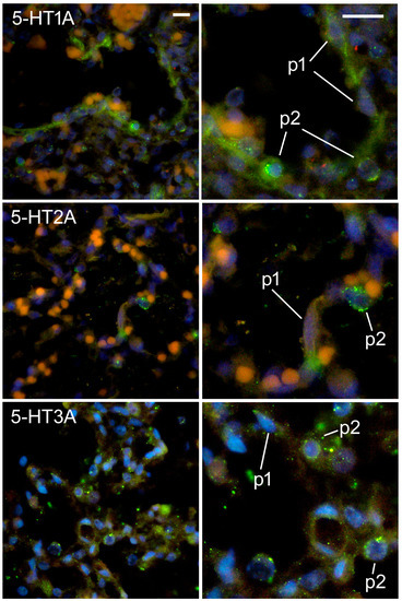 Immunofluorescence staining of fetal human lungs at the alveolar developmental stage with 5-HT1A, 5-HT2A, and 5-HT3A and CD31/PECAM markers. Nuclear DNA DAPI staining was combined with 5-HT1A. Green staining indicates positive 5-HT1A receptor expression, whereas blue staining indicates nuclear staining with 6-diamidino-2-phenylindole dihydrochloride (DAPI). Images were taken at 400× (left column) and 1000× magnification (right column). Scale bar = 20 µm, see all images in the same column. p1—type I pneumocytes; p2—type II pneumocytes.
