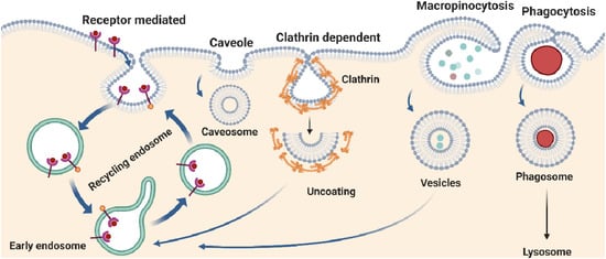 Endocytosis is a mechanistic process, associated with internalization of the extracellular materials such as microbes, cellular components, nutrients, or macromolecules []. Conventionally, eukaryotic cells use the endocytosis process for the absorption of molecules and secretion of signaling transmitters (hormones and cytokines) to maintain cellular homeostasis []. Endocytosis machinery is a well-conserved physiological process in lower to higher organisms, which has been frequently acquired for cellular defense, immune responses, uptake, and energy metabolism []. Earlier, the endocytosis process was exclusively attributed to the internalization of molecules across the plasma membrane, but with the methodological advancement, it has been found that endocytosis is providing a special route of cellular trafficking and signal transduction []. Notably, the cellular communication between the extracellular and intracellular compartment of the cell is becoming incredibly interesting to understand various cellular physiological and developmental processes during normal and pathophysiological consequences []. The cell surface receptors have a key role in the recognition of ligands and transduction of signals for various cellular events to define the fate of cells. Many cellular signaling events govern through internalization of plasma membrane receptor endocytosis signaling to coordinate the network between the extracellular and intracellular environment []. Christian de Duve in 1963 coined the terminology “endocytosis”, but the concept of the endocytosis process known as phagocytosis was defined by Elie Metchnikoff during the end of the 19th century followed by receiving the Nobel Prize in medicine in 1908. Endocytosis is a well-defined process of cellular logistics for material handling, processing, packaging, and transportation to cellular compartments.