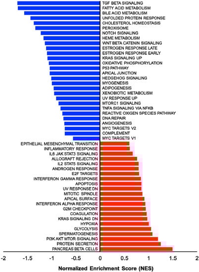 Gene set enrichment analysis (GSEA) showing enriched gene sets of Rubcn KO and WT group comparison. Bars in red (positive NES) indicate significant enrichment in KO phenotype and bars in blue indicate WT phenotype (negative NES). Data source available fromGSE118019 [].