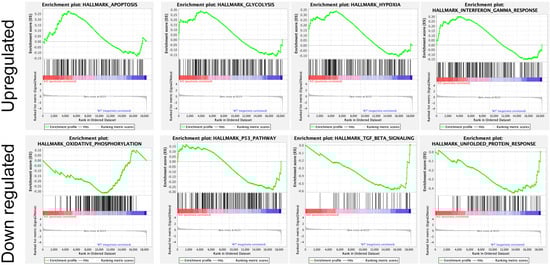 In addition, several studies showed the involvement of different classes of endocytic proteins in the invasion of multiple cancer types, including colon, breast, colorectal, and non-small cell lung carcinoma (NSCLC). Caveolin endocytic protein shows a regulatory function for breast, prostate, and ovarian cancer. In the early stage of these cancers, caveolin acts as a tumor suppressor, while in advanced stage, it is associated with tumor progression and metastasis [,]. Clathrin-mediated endocytic protein AP2 modulates the cell migration and invasion of pancreatic, ovarian, and melanoma cancer through CXCR2 []. Endosomal trafficking proteins such as ARF1 regulate breast cancer cell proliferation and migration through regulating the interaction of β1 integrin and protein of focal adhesion (paxillin, Fak, talin) [,]. ARF6 promotes cellular motility and invasion of glioma and breast cancer cells by inducing internalization of E-cadherin and breakdown of adherence junction []. Further, endocytic proteins of the RAB subfamily such as RAB3C and RAB3D control invasion and metastasis of colorectal and breast cancer, respectively. Elevated expression of RAB3C promotes in vivo migration, invasion, and metastasis of colorectal cancer while RAB3D induced breast cancer cell invasion by activating Akt/GSK-3β/Snail pathway [,]. Endosomal-associated protein RAB5 promotes tumor cell migration and invasion, focal adhesion turnover, and integrin trafficking of cancer cells [,]. RAB21 controls integrin-mediated cell adhesion and motility of cervical cancer cells. Earlier studies paved a way to identify autophagy signaling proteins as a target to map their interaction with endocytic proteins and cross-regulation in tumor progression. However, identifying such targets is still challenging. Targeting the most viable endocytosis-associated gene(s) may help to achieve this goal. One of the recent studies used RNAseq expression in Rubcn knockout (KO) and wildtype (WT) group (GSE118019) []. We also analyzed Rubcn gene expression in two different conditions to further explore the list of gene signatures, pathways enriched in the presence as well as absence of Rubcn. In order to understand the phagocytosis in tumors and their consequences, we performed gene set enrichment analysis (GSEA) (Figure 2). Interestingly, in GSEA, we identified several important pathways such as apoptosis, glycolysis, hypoxia, and IFNγ response enriched in KO group (Figure 3). Similarly, using differential gene expression analysis, we identified several important genes such as Rab4a, Gzme, Glrp1 that were upregulated in Rubcn KO group. This analysis suggests that the knock-out of endocytosis-associated genes also accelerates a more immunogenic microenvironment.