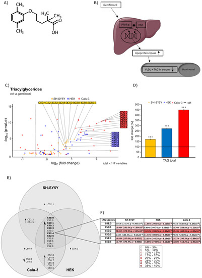 Interestingly, gemfibrozil treatment resulted in significantly increased intracellular TAG levels in all three cell lines (SH-SY5Y p ≤ 0.001; HEK p ≤ 0.001; Calu-3 p ≤ 0.001, see Figure 1D). There is a clear rightward shift within the volcano plot (Figure 1C).