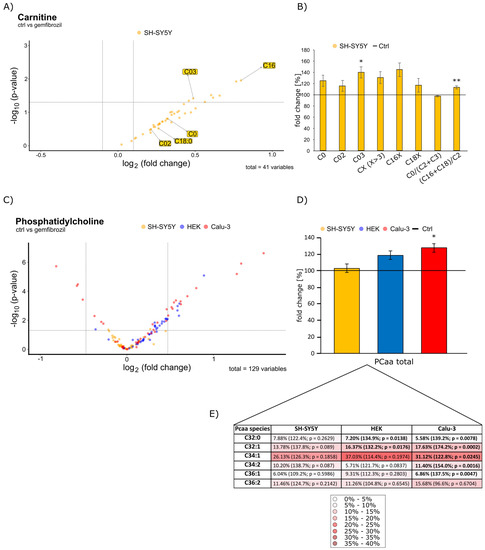 (A) Changed carnitine levels in SH-SY5Y cells after Gemfibrozil treatment compared to cells treated with the solvent control (ethanol) are illustrated in the volcano plot, where the fold change (x-axis) of each of the 41 examined carnitine species (dots) was plotted against the corresponding logarithmic p-value (y-axis). The volcano plot is structured as described in detail in the legend of Figure 1. (B) The bar chart shows the relative fold changes in C0, C2, C3, CX (X > 3) and (C16 + C18)/C2 ratio in Gemfibrozil treated SH-SY5Y cells compared to cells treated with the solvent control (ethanol), which is represented as the horizontal line and set as 100%. The obtained data were calculated by using the students t-test of gemfibrozil-treated cells against the control of SH-SY5Y-cells, with * p ≤ 0.05 and ** p ≤ 0.01. (C) Changed Phosphatidylcholine (PCaa) levels in SH-SY5Y, HEK and Calu-3 cells after gemfibrozil treatment compared to cells treated with the solvent control (ethanol) are shown in the volcano plot, where the 43 analyzed PC aa species are plotted for each cell line in the same way as in the other volcano plots on the top. (D) A bar chart shows the relative fold change of PCaa total for each cell line treated with gemfibrozil and compared to cells treated with the solvent control (ethanol) marked as horizontal line (and set as 100%). The obtained data were calculated by using the students t-test of gemfibrozil-treated cells against the control of each cell line, with * p ≤ 0.05. (E) The heatmap shows the respective major species of all PCaa species examined that are most represented in percentage within a cell line. According to their percentage frequency, they were highlighted with different intensities of red coloration, whereby the higher the percentage, the more intense the red coloration. The respective effect size is indicated in parentheses and the shown p-values were calculated using the students t-test of gemfibrozil-treated cells against the control per cell line.