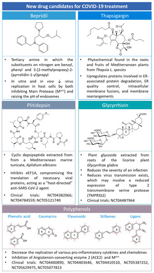 The chemical structure of drugs that are candidates for COVID-19 treatment, e.g., bepridil, thapsigargin, plitidepsin, glycyrrhizin, and polyphenols. Polyphenol structures were adapted from [75] under a Creative Common CC BY license.